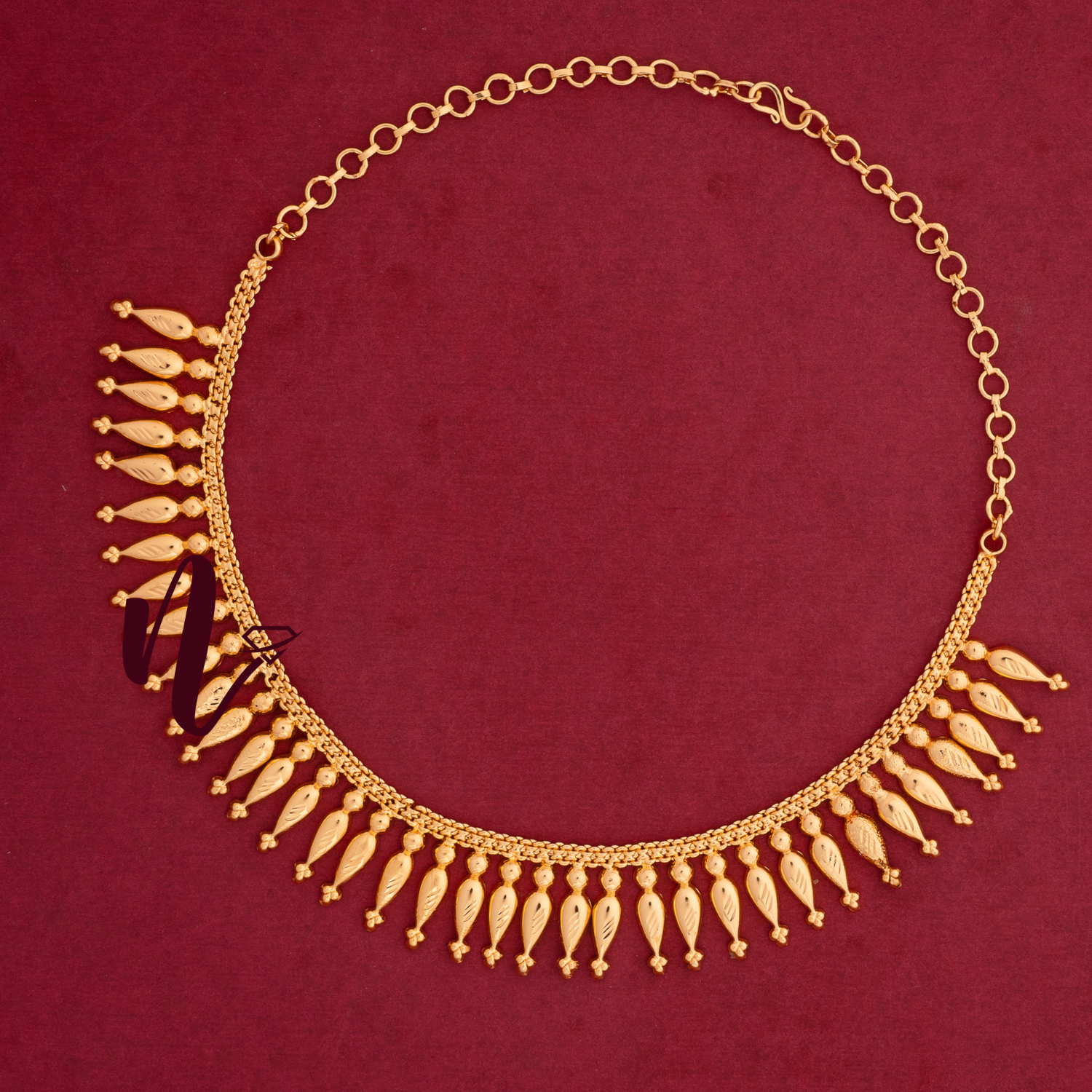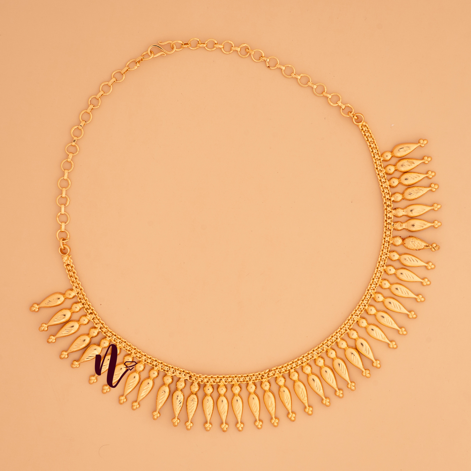 The Gopi Mulla Necklace N06 features a traditional Kerala-style Urvashi chain and gopi mulla with a variety of intricate pattern designs. This elegant necklace is perfect for all types of parties, blending cultural heritage with sophisticated craftsmanship. Its unique patterns and classic appeal make it a versatile accessory that enhances any festive or formal outfit.