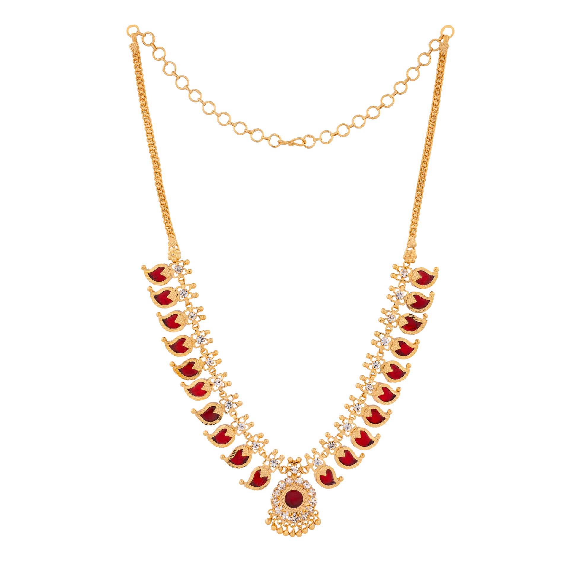 Our 10 Petal Mango Mala is a perfect choice for women who want to complete their traditional South Indian look. This necklace is designed to match all traditional outfits, making it ideal for any special occasion.