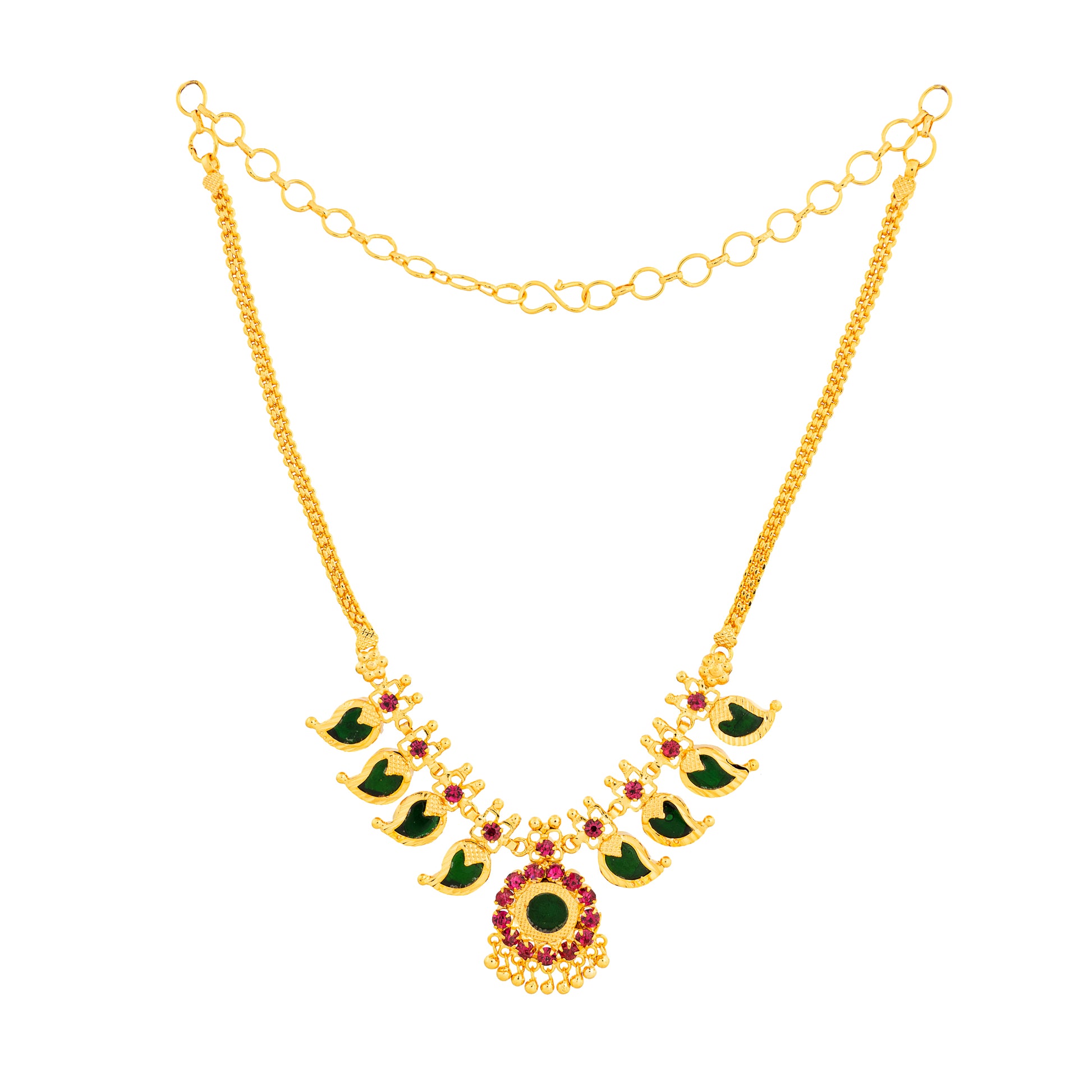 This 4-petal Mango mala is a beautifully crafted traditional necklace, measuring 10 inches in length. Made of copper with 23.5 kt micro gold plating, it showcases a stunning design with petals on both sides, giving it the look of real gold. The mala features excellent craftsmanship, ensuring good quality, fine finishing, and a rich appearance. Perfect for adding a touch of elegance to any outfit.