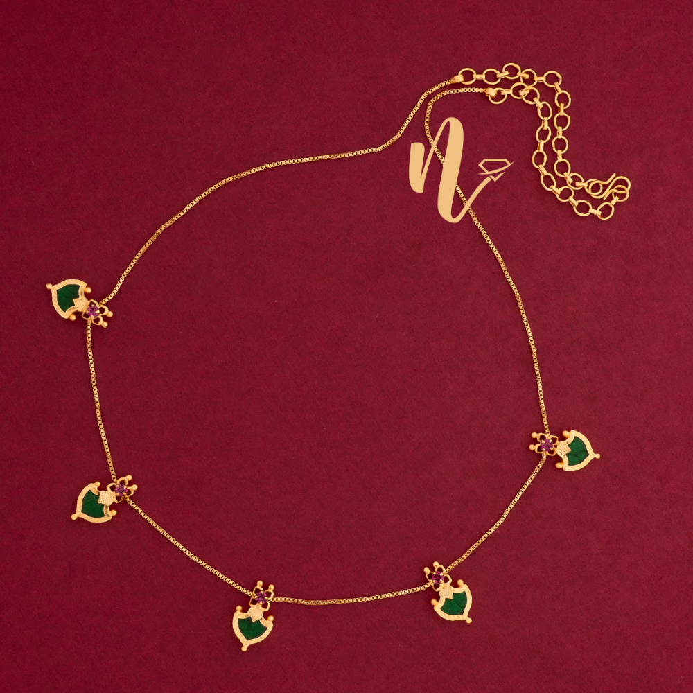 The Invisible Palakka Necklace features five green Palakka stones elegantly arranged around the neck, creating a subtle yet captivating look. This necklace offers versatile style suitable for all ages, blending traditional charm with modern design for everyday wear or special occasions. Its refined craftsmanship ensures comfort and durability, making it a timeless addition to any jewelry collection.
