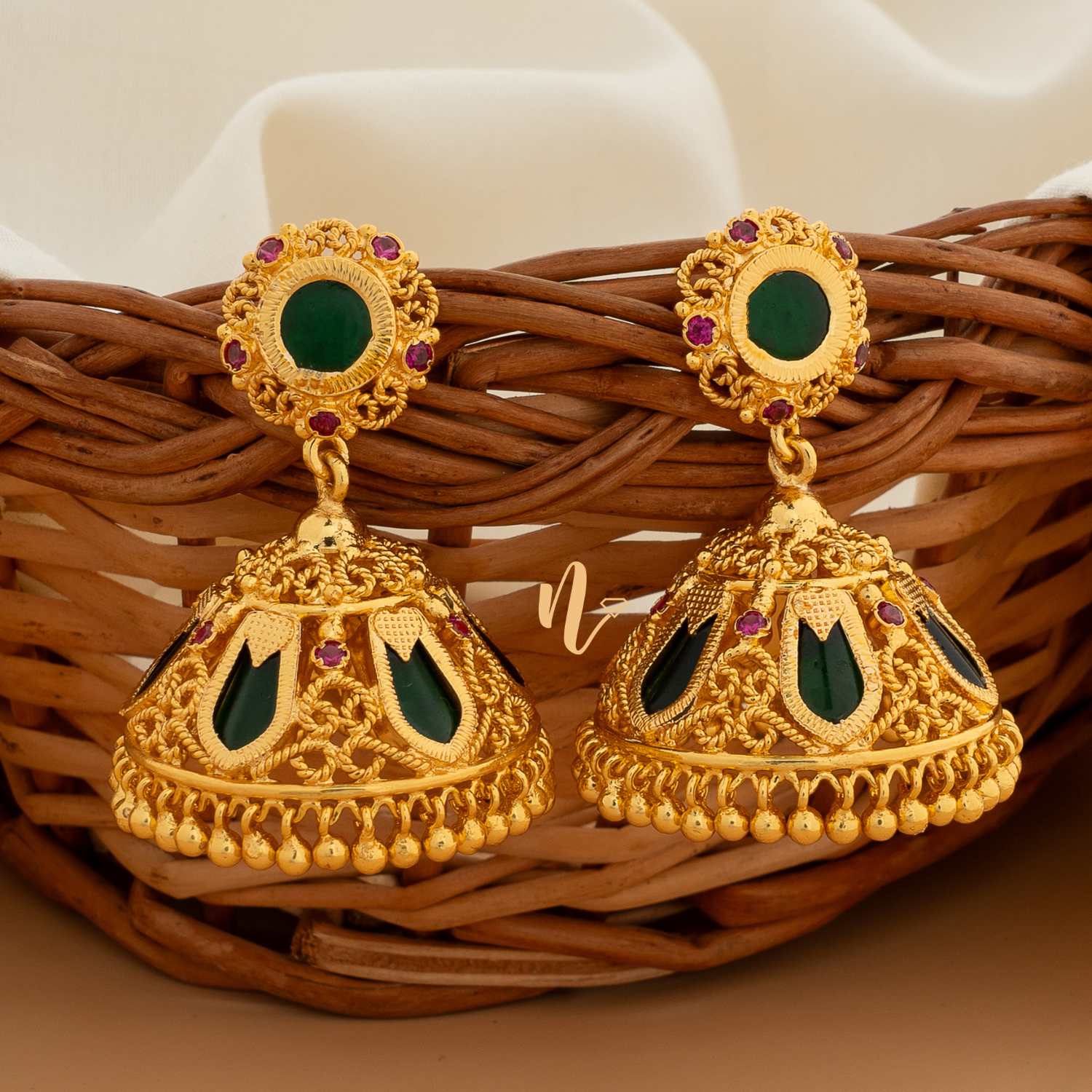 The Nagapadam Jhuka J35 G is a refined piece from Kerala's traditional Nagapadam collection, with pattern made from fine golden wire . Featuring a delicate blend of pink and green accents complemented by elegant hanging beads, this jhumka suits all ages, offering timeless charm and cultural elegance. Perfect for those seeking authentic craftsmanship with a subtle yet striking design.