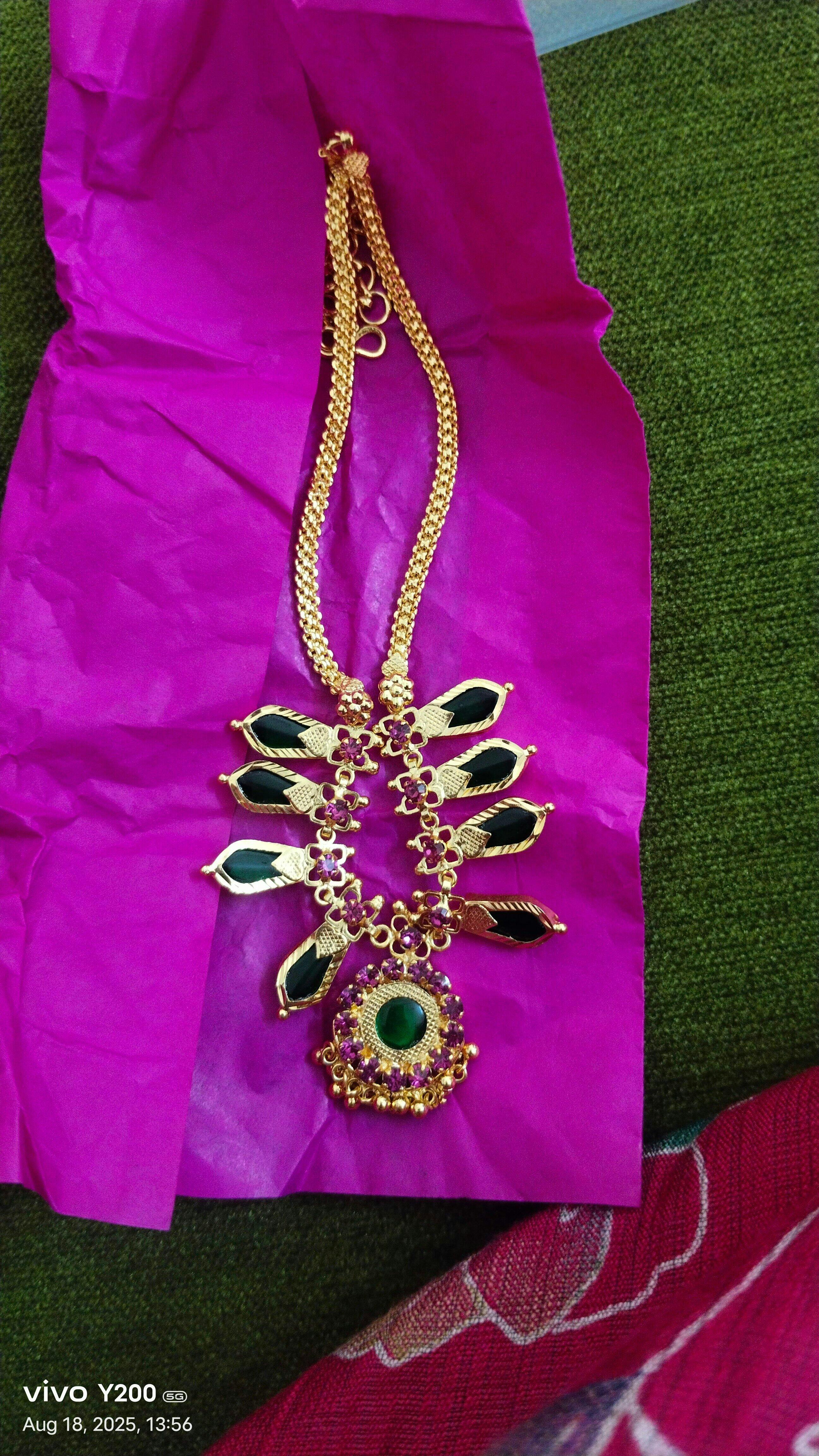 This 4-petal Nagapadom mala is a beautifully crafted traditional necklace, measuring 10 inches in length. Made of copper with 23.5 kt micro gold plating, it showcases a stunning design with petals on both sides, giving it the look of real gold. The mala features excellent craftsmanship, ensuring good quality, fine finishing, and a rich appearance. Perfect for adding a touch of elegance to any outfit.