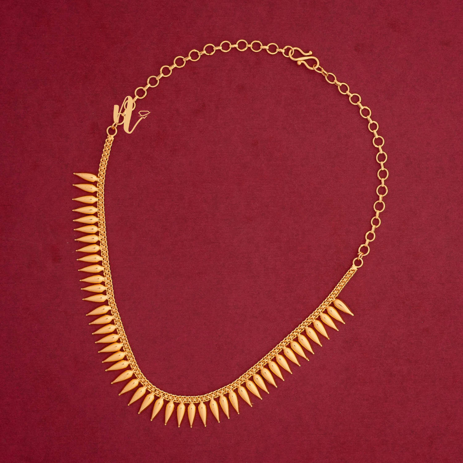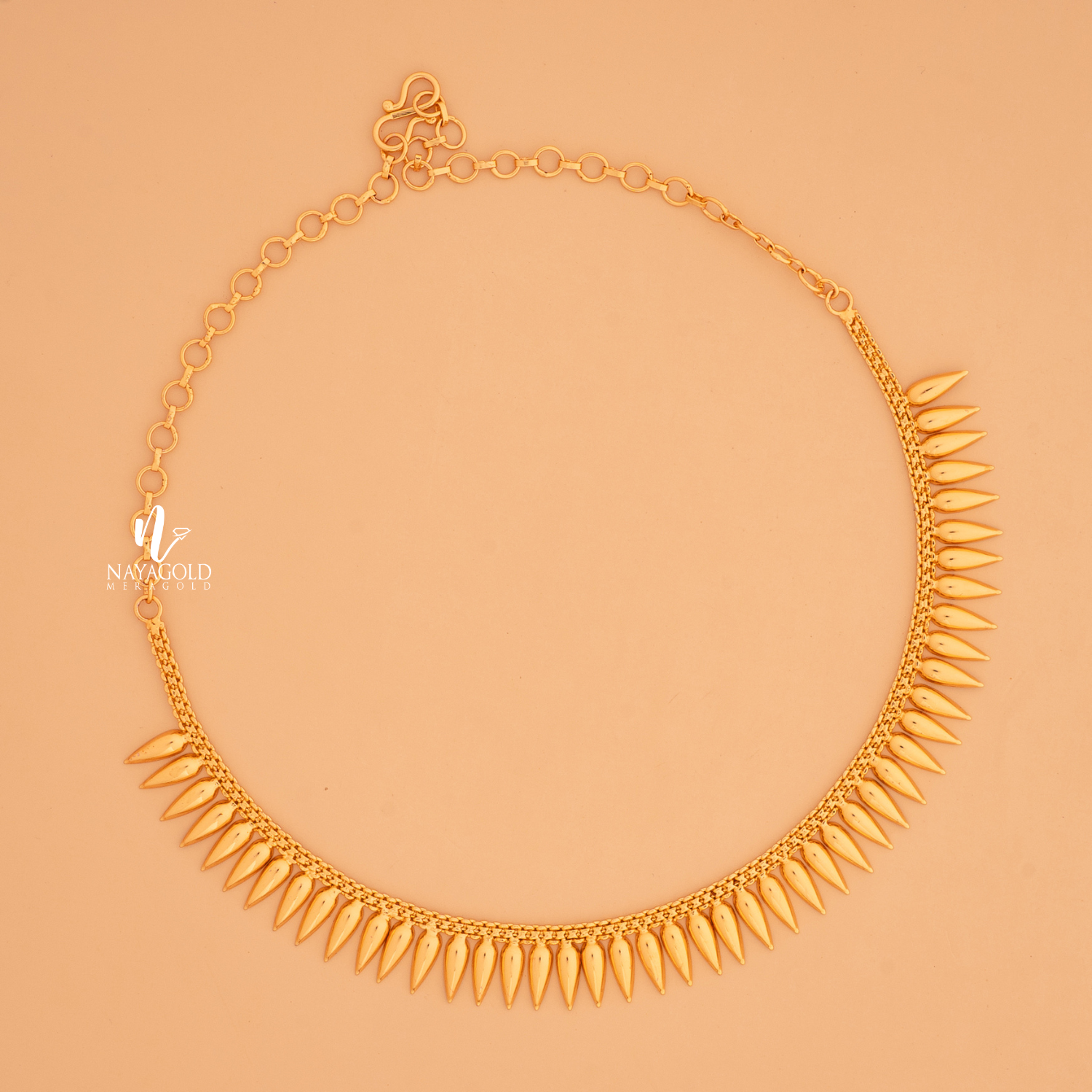The Plain Mulla Necklace N08 showcases the timeless Mullai Mottu design, a hallmark of traditional Kerala bridal jewelry. Expertly crafted from copper with a refined gold plating, it delivers the luxurious appearance of real gold while remaining accessible for all ages. This elegant mala necklace combines cultural heritage with a polished shine, making it a distinguished choice for weddings and special occasions.